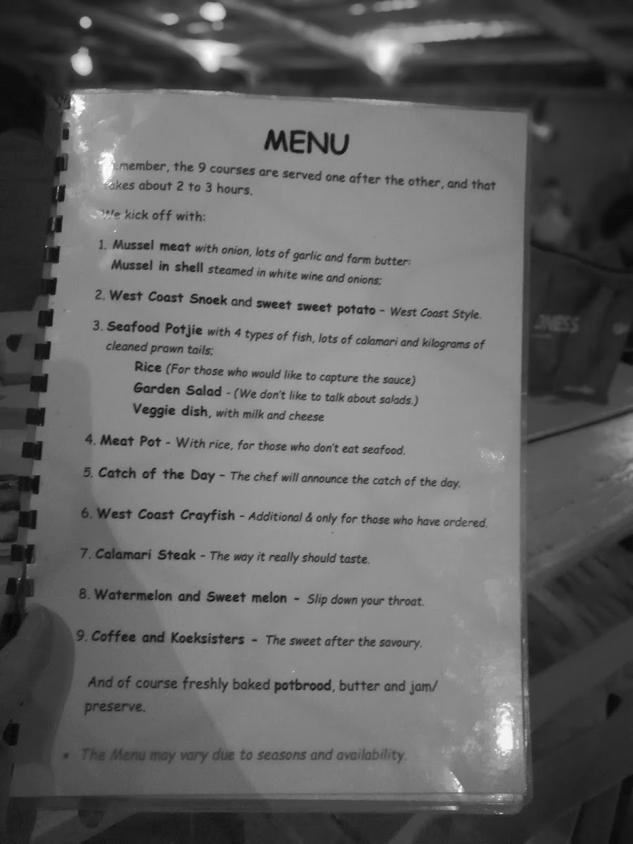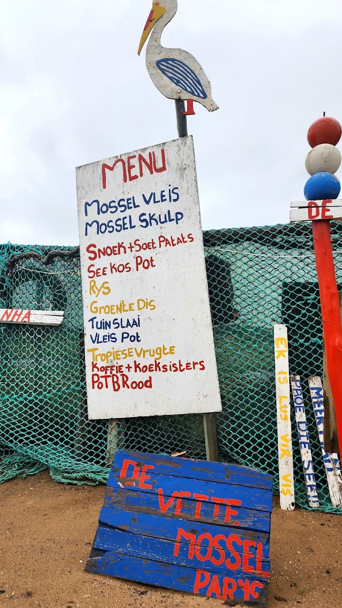 From a reviewer’s perspective, the menu at De Vette Mossel Parys delivers a satisfying and well-rounded seafood-focused experience that feels both rustic and indulgent. Signature dishes like Prawns, Fish, and Calamari Steaks highlight the restaurant’s commitment to fresh, well-prepared ocean flavors, while regional specialties such as West Coast Snoek and Sweet Sweet Potato and West Coast Crayfish add a distinctly South African character to the menu. The hearty potjie selection stands out as a defining element, with comforting options like Seafood Potjie, Meat Potjie, Beef Potjie, and the generous Seafood and Oxtail Potjie with Rice and Salad, all offering slow-cooked depth and satisfying portions. Mussel lovers are particularly well catered for, with choices including Mussels in Shell and Mussle Meat, Mussels Pot and Potbread, and Potbread and Mussel Pot, each reinforcing the restaurant’s coastal identity. Supporting dishes such as Mixed Vegetables, Vegetables Made with Milk and Cheese, Salad and Rice, and Meat Potjie accompaniments balance the menu with comforting, home-style flavors. To round off the experience, refreshing drinks like the Strawberry Daiquiri, classic Wine Options, and traditional treats such as Koffie & Koeksisters provide a relaxed and enjoyable finish. Overall, the menu feels cohesive and thoughtfully curated, combining seafood classics, hearty local dishes, and simple comforts into a dining experience that is both memorable and satisfying.